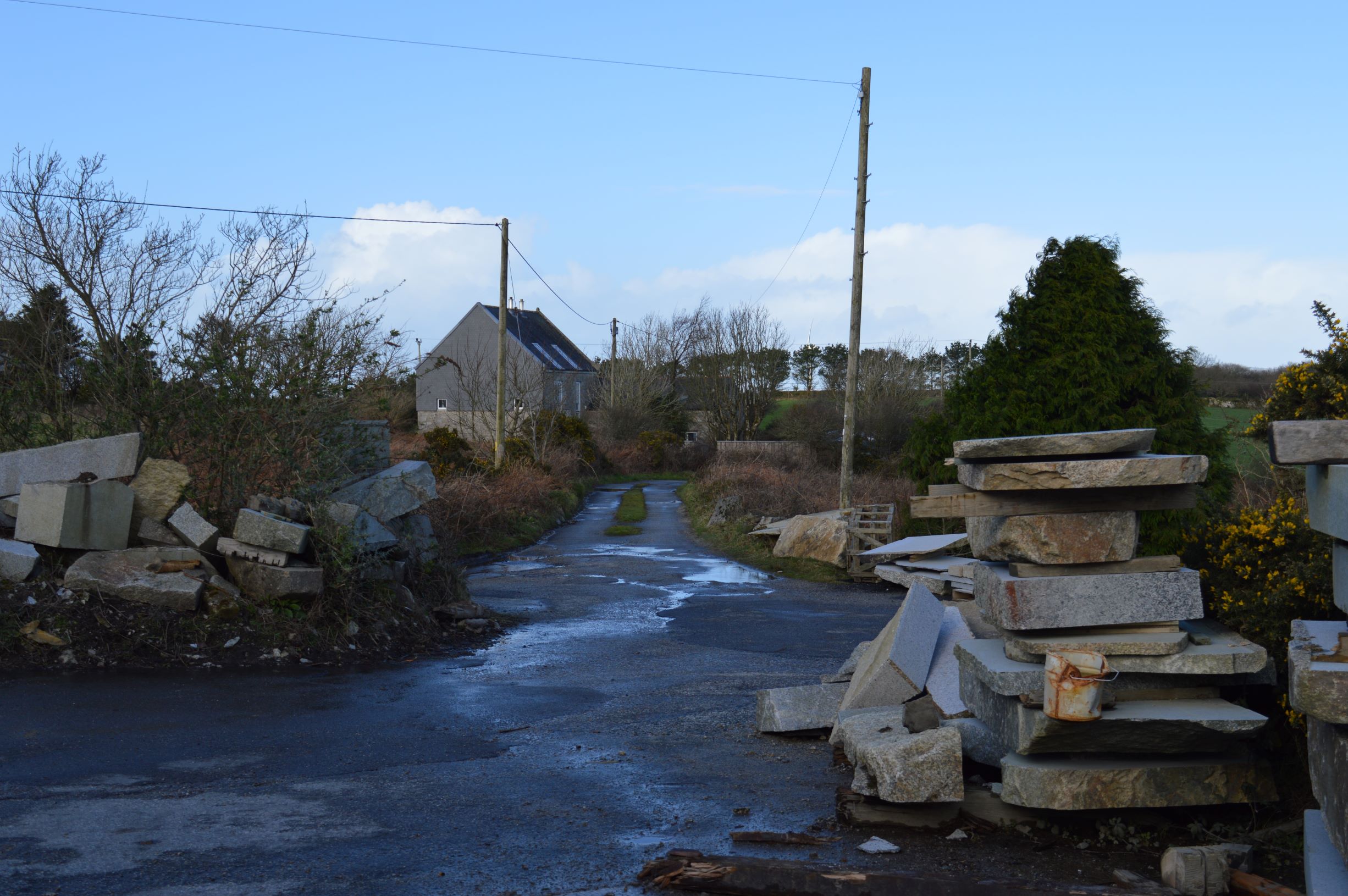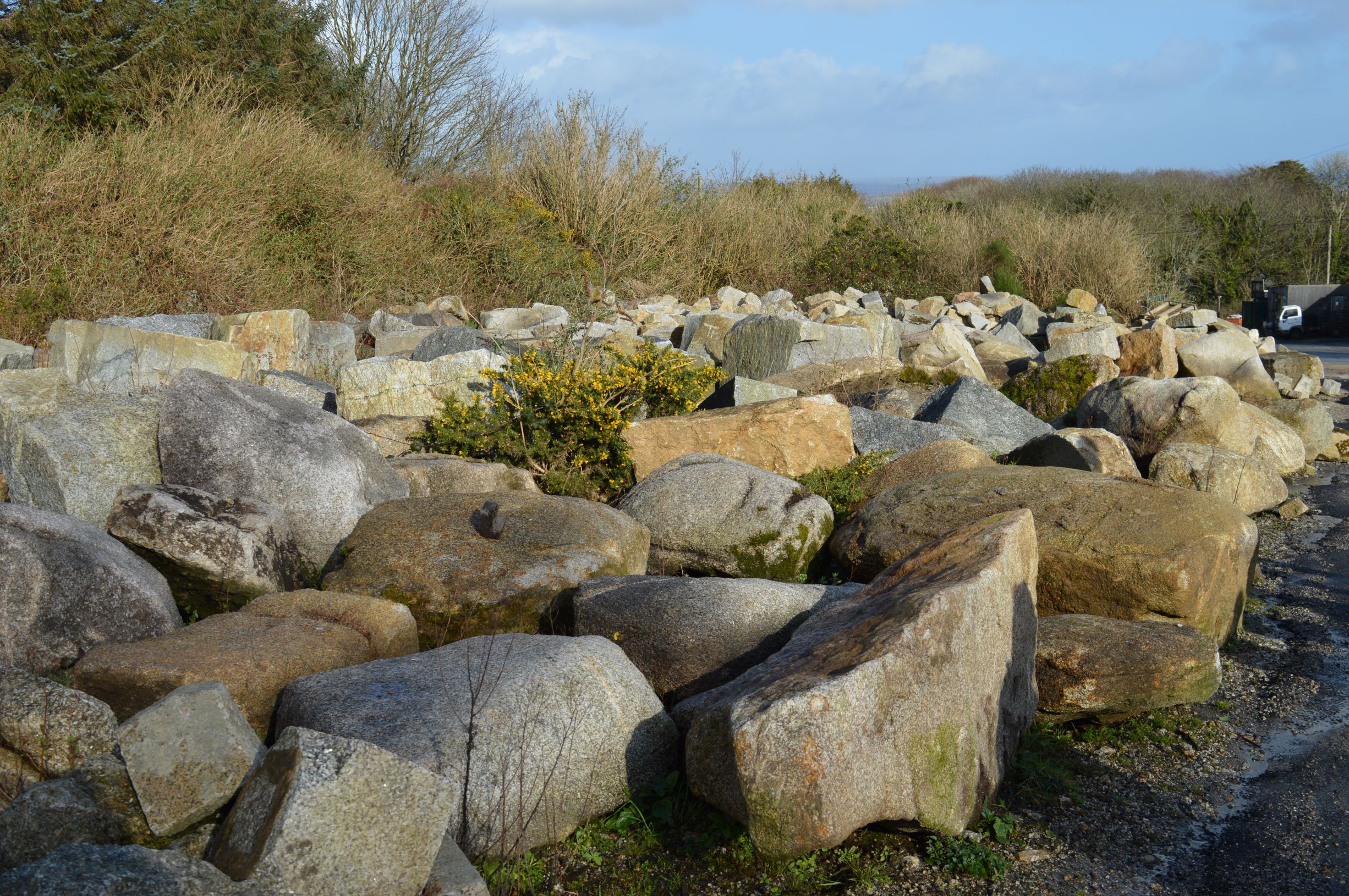 On Tuesday I attended a trip to a Trenoweth Quarry, near Penryn, with David Paton (Associate Lecturer – works part time at the quarry, making art with the Cornish granite). We met at Penryn campus and walked from there, through local farms and other nearby quarries. The walk was good for contextualisation, giving us a bit of a feel for the local landscape and in particular the local politics; I learnt about mineral rights between the farms and the quarries, land ownership, the difference between monumental and aggregate quarrying, the variation in size of the quarries (e.g. Carnsew as compared to Trenoweth) and just generally the exposed conditions and surroundings of the quarries. Being with someone who worked at the quarry was a great way of being introduced to the place from an insider’s perspective, being able to chat to everyone that worked there and not feel as though you were intruding (some footpaths go in and around nearby quarries but the signage around the pits isn’t exactly encouraging the public to come in and explore).