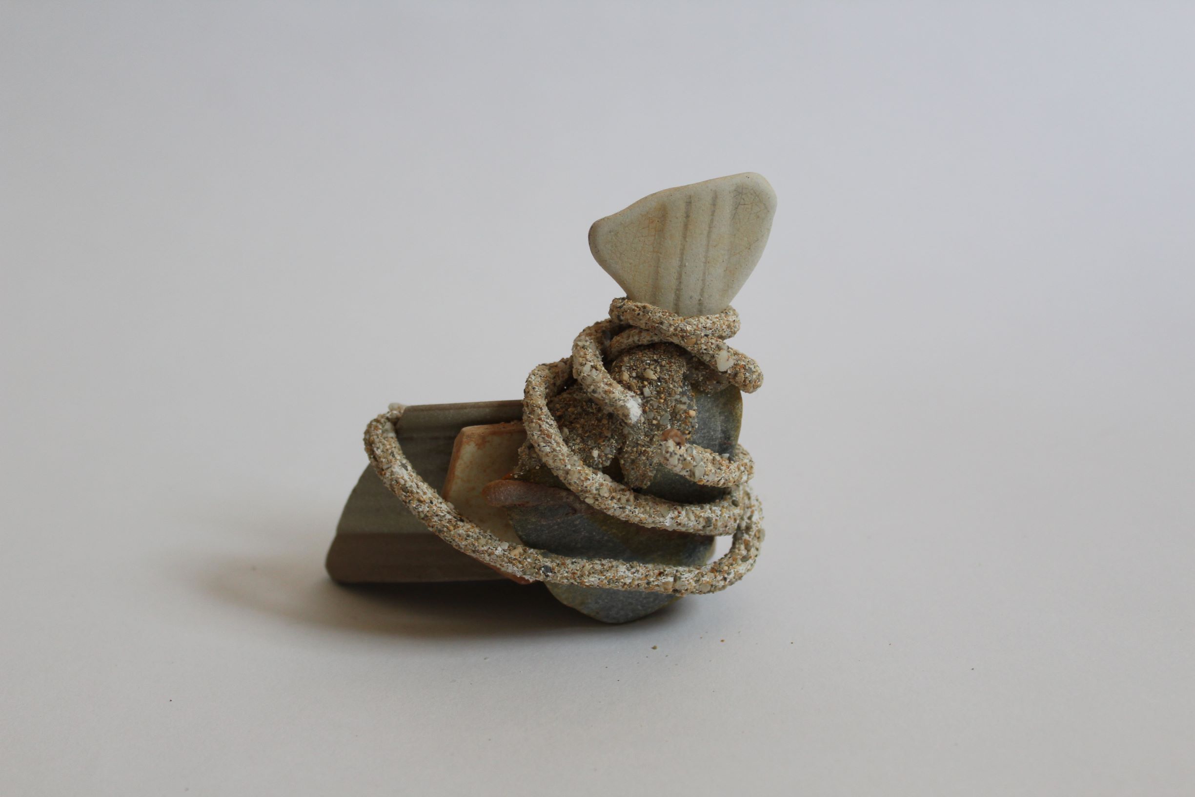 These last two experiments both use a combination of glue, clay and sand to merge the individual parts together, but instead of using the clay in neat strings as previously, here I have used it more roughly. This, along with the use of sand to break it up further, I feel is more successful at creating earthy, tangly sculptures which nicely tread this line between being ‘human’ artifacts that have washed up (particularly the top one with the identifiable bottle top) and encrusted, conglomerated ‘naturally occurring’ things. This combination reminds me of Victoria Adam’s work, particularly how she places human and nonhuman items alongside one another, in doing so establishing a gentle inquiry into their similarities and differences, both aesthetically and in terms of utility.